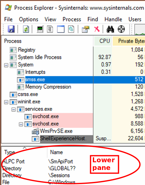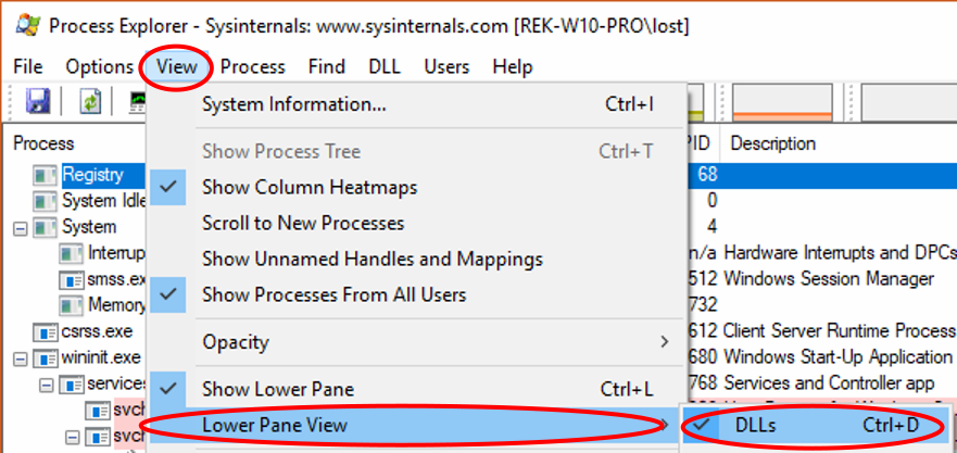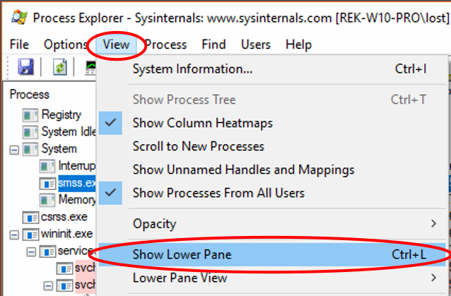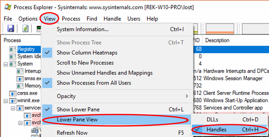 - Ctrl+H Shows the handles a process has loaded, in the lower pane, showing it if it isn't already displayed.
