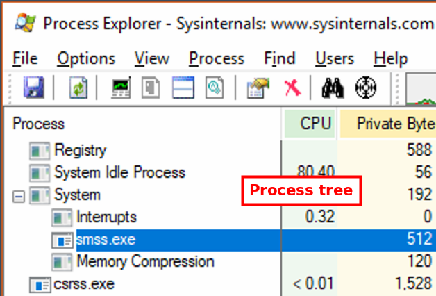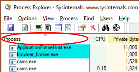 When Process Explorer starts, you will see an hierarchical view of the running processes on your system.