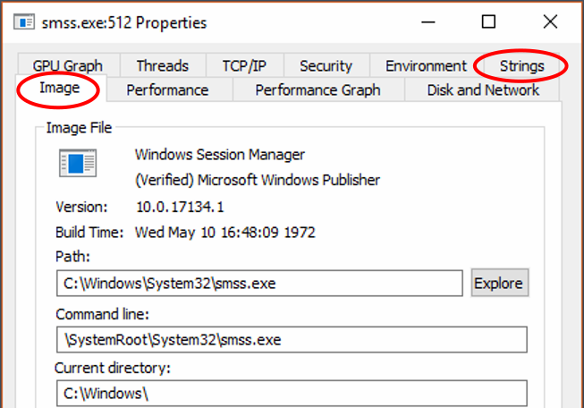 The two most useful tabs are the Image tab which shows you the command line for the process, and the Strings tab so you can view embedded strings.