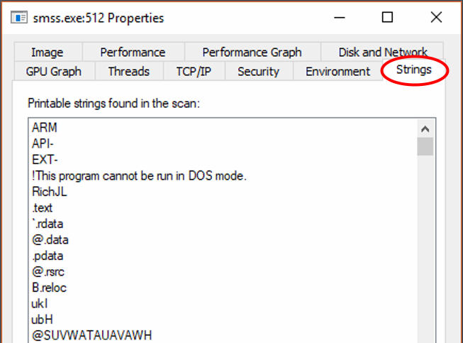 To view strings for a process, open its properties, and select the Strings tab.