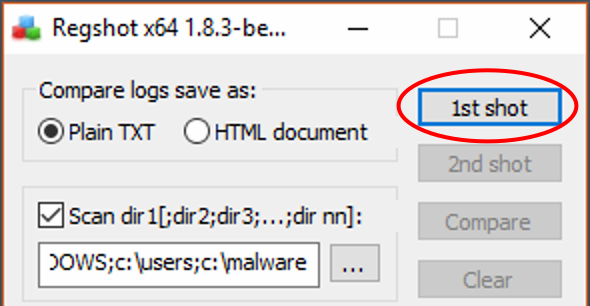 The first thing to do with Regshot is take your 1st shot. To do this click the 1st shot button on the right: