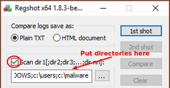 By default Regshot examines the registry for changes, but you can also have it examine the file system. Do do this, click on the check box next to "Scan dir", and then enter the directories to scan in the box beneath it.